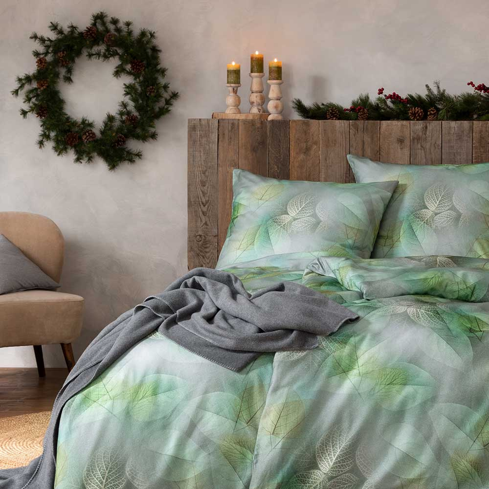 Pościel Laurin jest idealnym wyborem dla wszystkich, którzy pragną więcej zieleni w swoim domu. Zestaw wyróżnia się pełnym wzorem liści, który rozkłada się na tkaninie w delikatnej grze światła i cienia. Różne odcienie zieleni harmonijnie współgrają z kolorami otoczenia w różnych sypialniach i pokojach gościnnych, nadając im naturalną aurę.